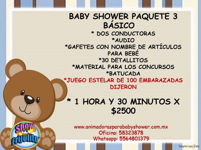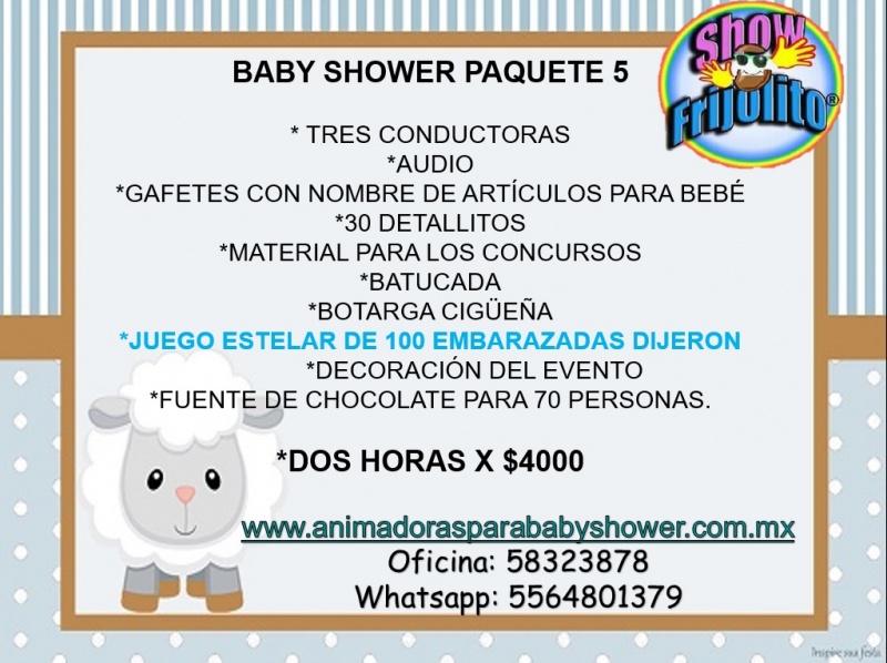 Hola quisiera saber cuanto es el costo para un espectáculo de baby shawer y que es lo que ofrecen en el mismo. Gracias por su atención y esperando su respuesta,